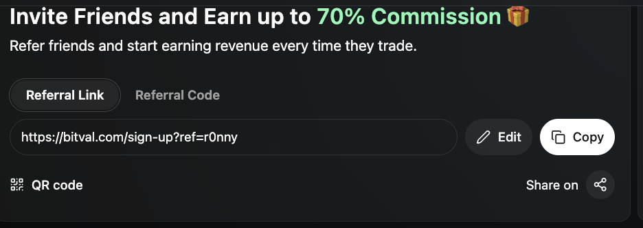 Choose a custom name or short handle to personalize your referral URL (e.g. bitval.com/sign-up?ref=tonyBRO).